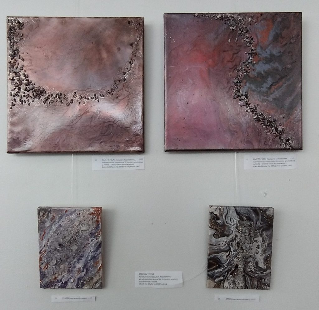 Kotimaiset ametistini on käsin (ei koneellisesti) kaivettuja ja rumpuhiottuja Yli-Luoston ametisteja ja muita kiviä. Nämä ovat Suomalaisen perheyrityksen kaivamia ja Luonnon purossa ekologisesti rumpuhiottuja ja yksitellen valikoituja luonnon kristalleja. Lappilainen yrittäjä on myös myös kullan tuottaja ja kivituotteita tulee heiltä ihan lemmenjoelta asti. Yhteistyö lähti taideidean pohjalta kun tilasin ensimmäiset ametistini heiltä taidekokeiluun.