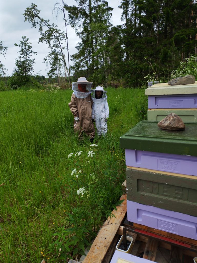 En aivan yksi ole mehiläisiä hoitanut vaan välillä mukana on kulkenut omaa väkeä. Lapset on olleet kiinnostuneita mehiläisistä myös ja mies on ollut apuna kun on tarvittu apuja korkeiden tornien tai painavien rakentelujen kanssa. Myös mehiläishoitokurssilaiset ja lähialueen tarhaajat ovat olleet korvaamaton apu mehiläishoidon alkutaipaleellani.